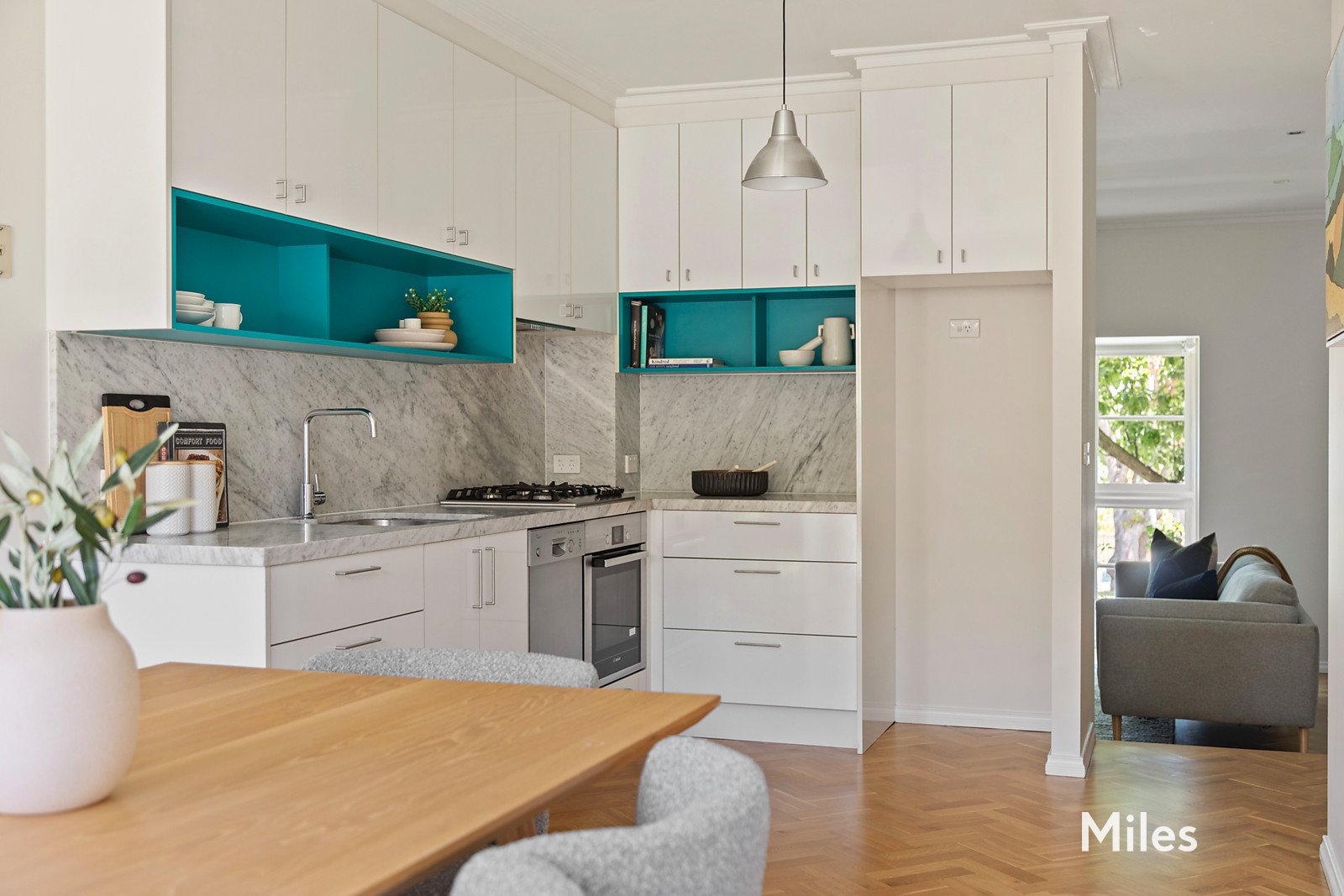 Further at the rear is a ground-floor laundry/toilet and a superb gourmet kitchen boasting Carrara marble benchtops, Bosch stainless-steel appliances and soft-close cabinetry, before a generous dining room flowing out to a private, sun-drenched courtyard garden for relaxed indoor-outdoor entertaining.