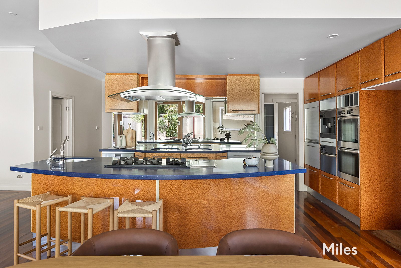 The heart of the home unfolds at the rear, where an expansive open plan living and dining domain is anchored by a beautifully appointed kitchen with a large island bench, premium stainless steel appliances, dual ovens and a generous walk-in pantry.