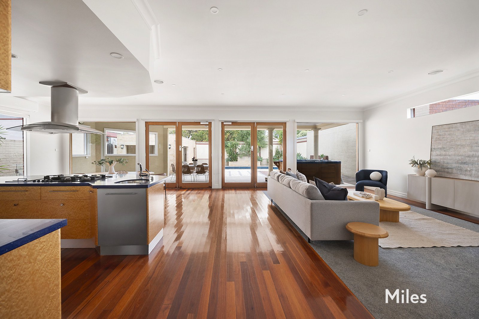 French doors open to a covered alfresco area, paved courtyard and deck, alongside a sparkling in-ground self-cleaning salt water pool and separate pool house, creating a superb indoor-outdoor lifestyle environment.
