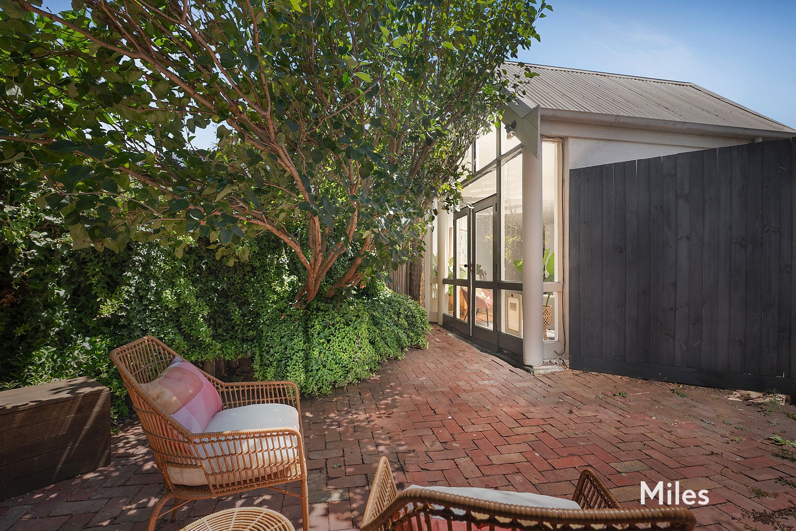 Two generous, light-filled bedrooms at the front of the home both include built-in robes and are serviced by a beautifully renovated central bathroom incorporating discreet laundry facilities. The living space opens directly to a large paved and landscaped courtyard, ideal for alfresco dining, relaxed gatherings, or quiet moments of retreat.