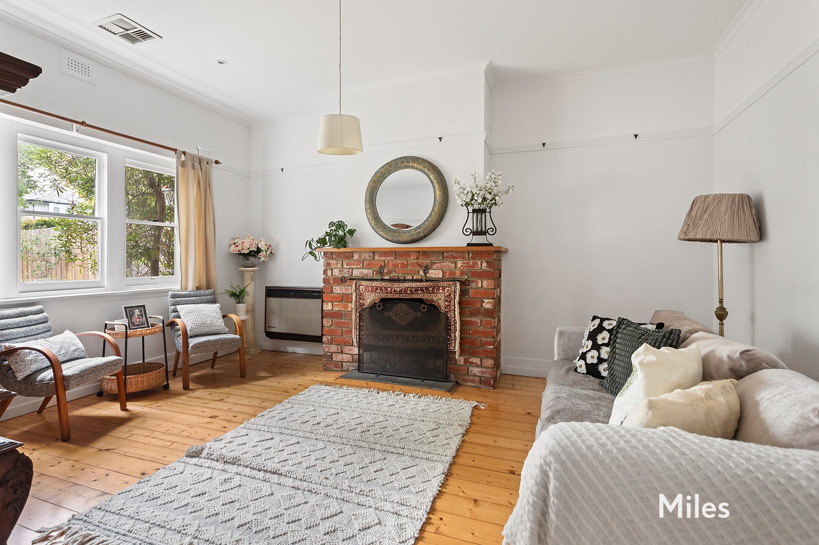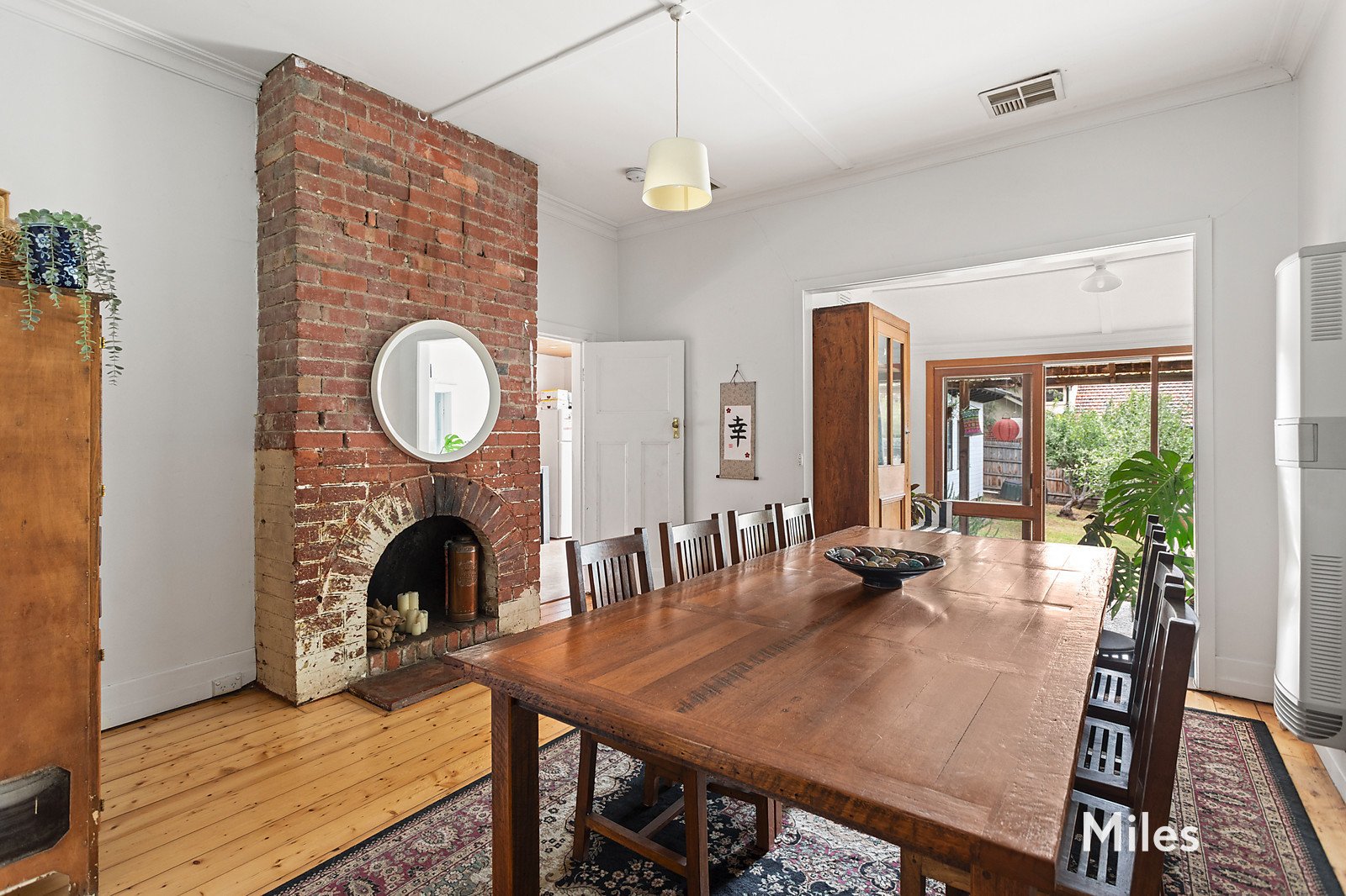 A kitchen and meals area updated with Bosch and Miele stainless-steel appliances adjoins a large dining room with an arched brick fireplace, before a generous bathroom and a full-size laundry.
