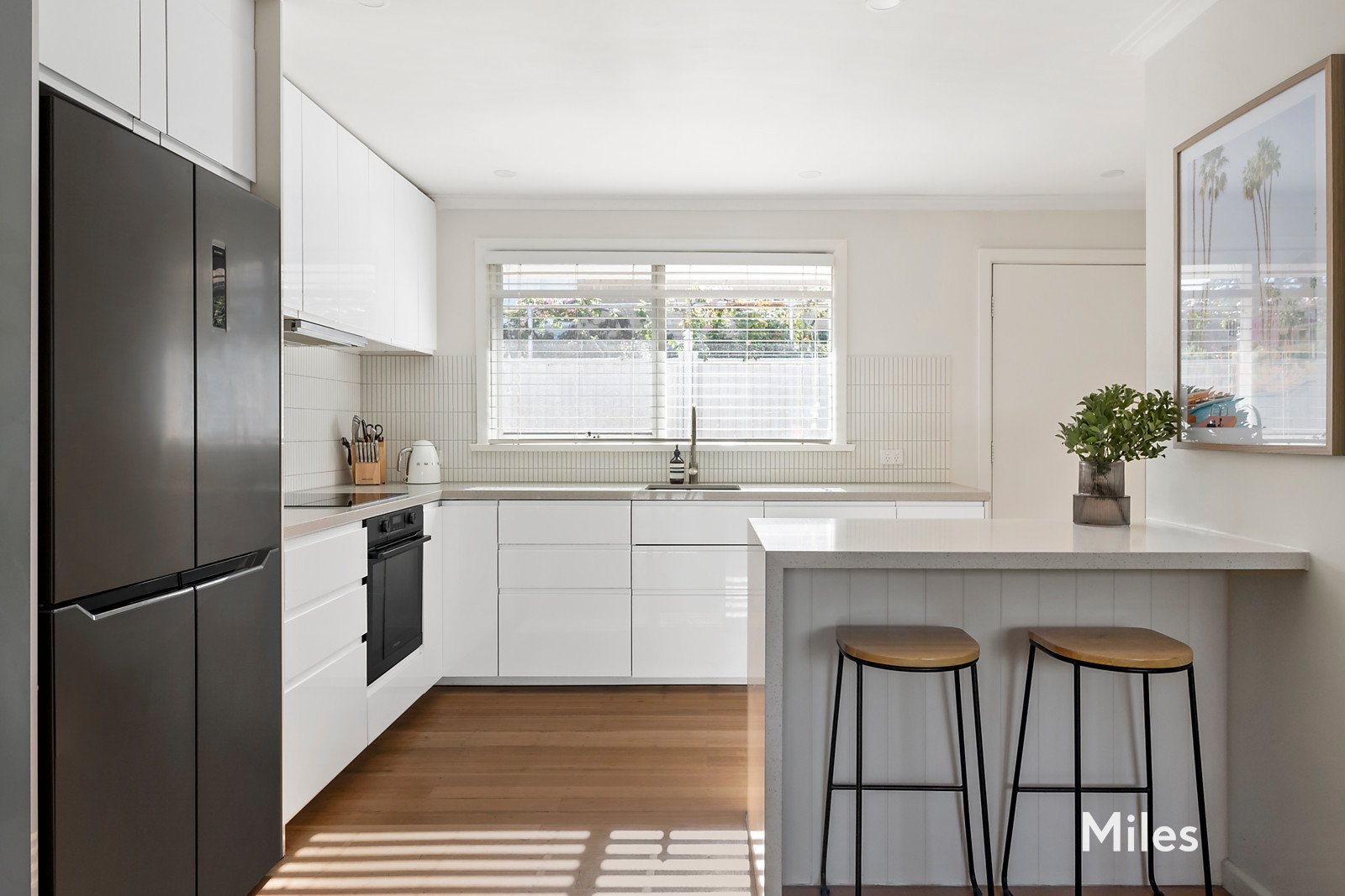 A refined, fully integrated kitchen features engineered stone waterfall benchtops, induction cooktop, pyrolytic under-bench oven, integrated dishwasher, and generous soft-close storage, including a large pantry.