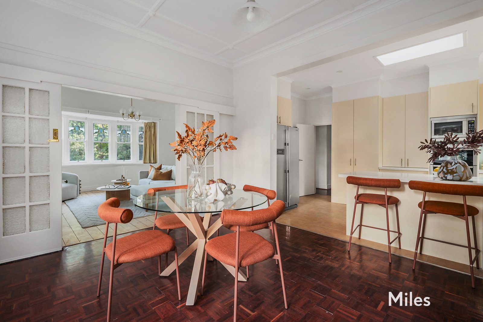 Each retaining their own identity through open fireplaces and colourful glazing, a north-facing living room capturing light and views extends to a separate formal dining room where connected via a breakfast servery, lies a perfectly-updated kitchen featuring a Smeg stainless-steel cooktop, Neff double ovens, a dual-drawer dishwasher and an etched glass window that quietly references the home's warm-hearted history.