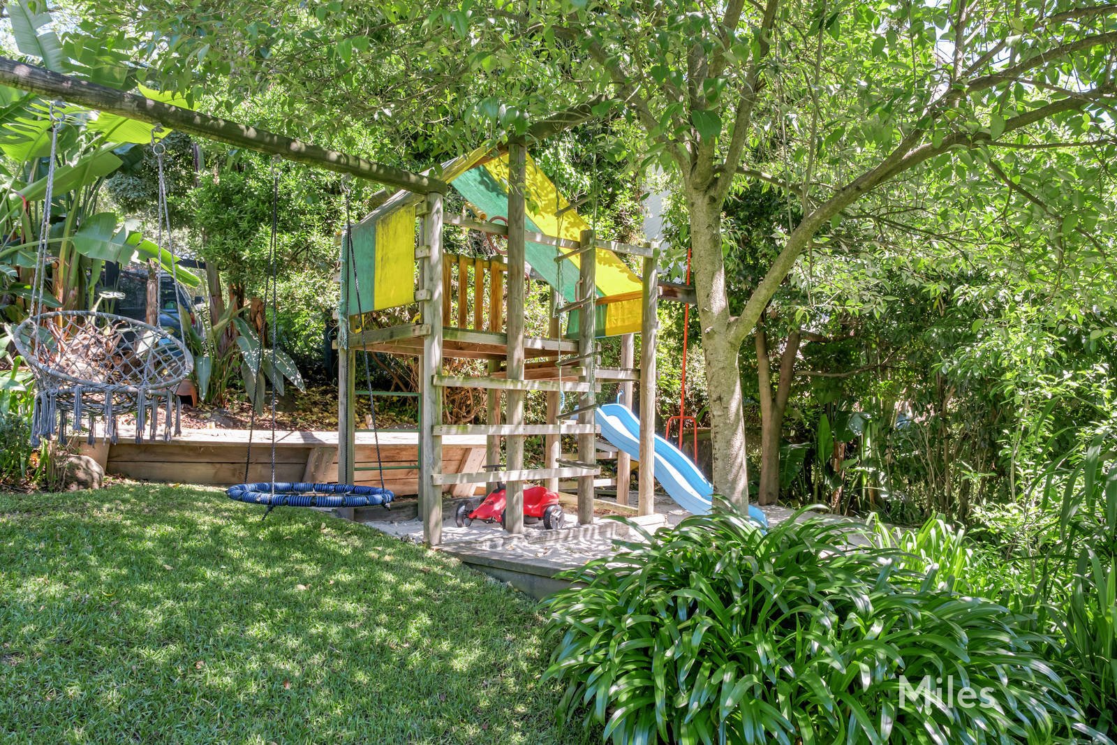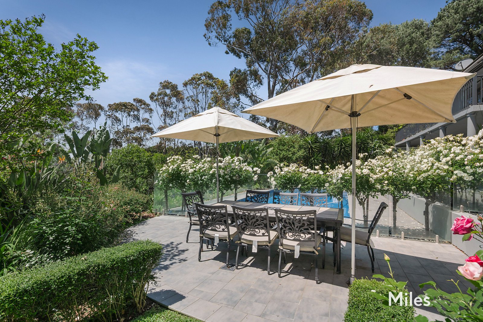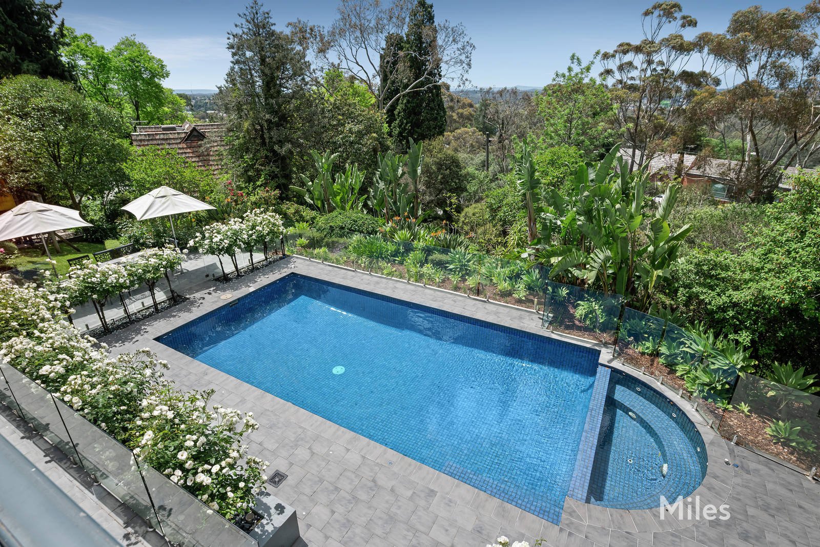 A private playground for the entire family, the east-facing outdoor oasis with its impeccably manicured roses, lawns and palm groves is centred around a solar/gas-heated swimming pool and spa, and features entertainment terraces and a children's adventure play area.