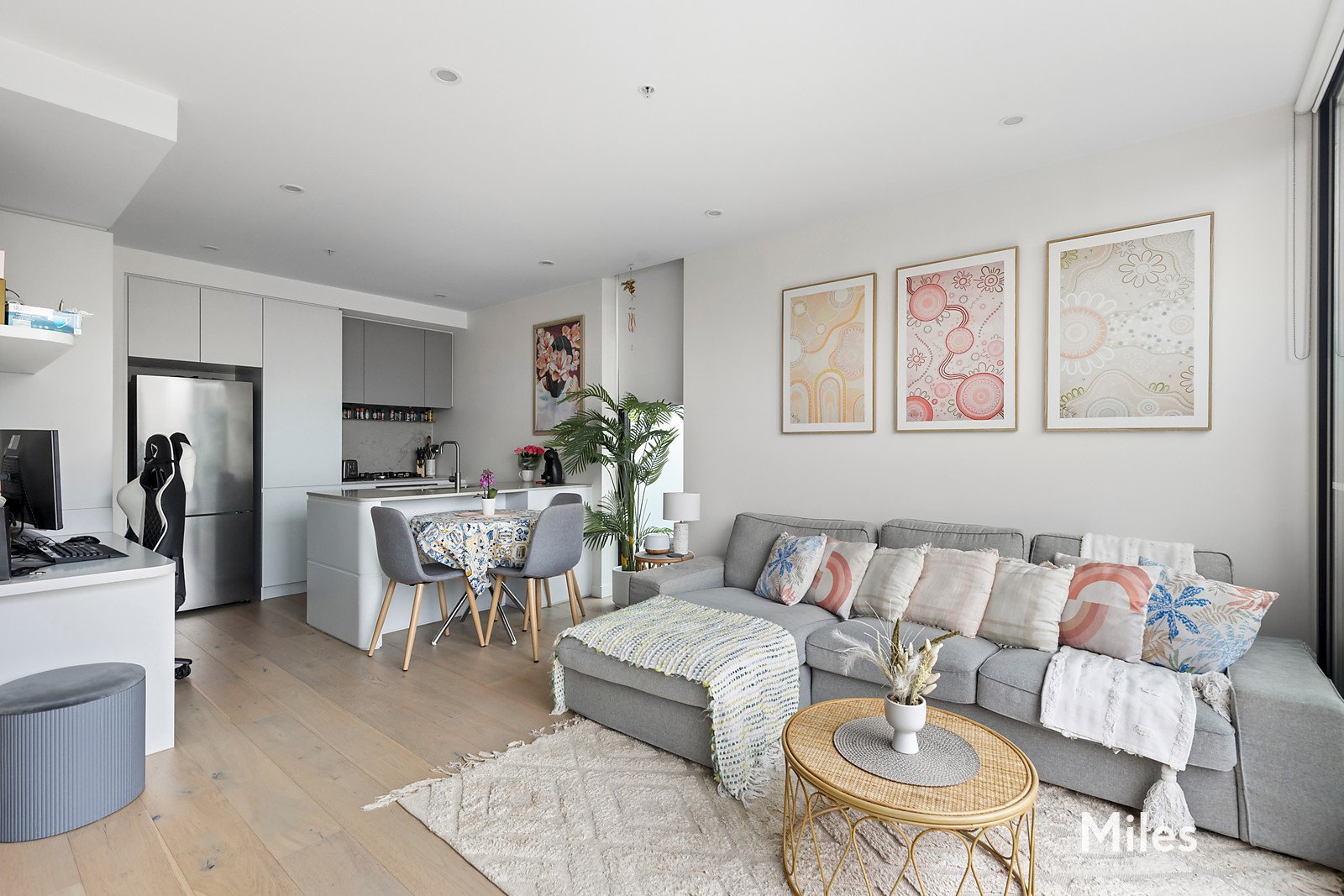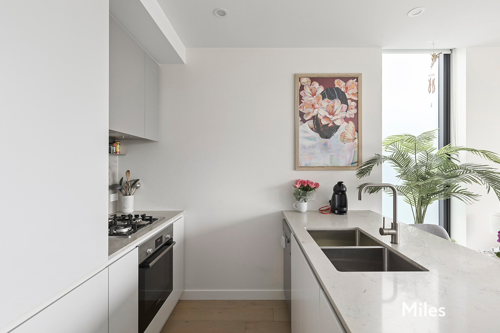 A stylish sanctuary with premium features unfolds at a hallway entrance where crisp clean-lined ceilings and elegant oak floorboards extend through to a spacious living and dining room that seamlessly transitions into a dedicated study area with a fitted desk and a stunning kitchen where thoughtful design meets functionality with a curved stone breakfast bench, Bosch stainless-steel appliances and even a spice ridge.