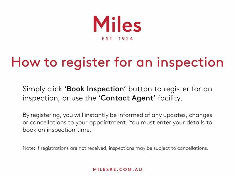 Simply click 'Book Inspection' button to register for an inspection, or use the 'Contact Agent' facility. By registering, you will instantly be informed of any updates, changes or cancellations to your appointment. You must enter your details to book an inspection time.