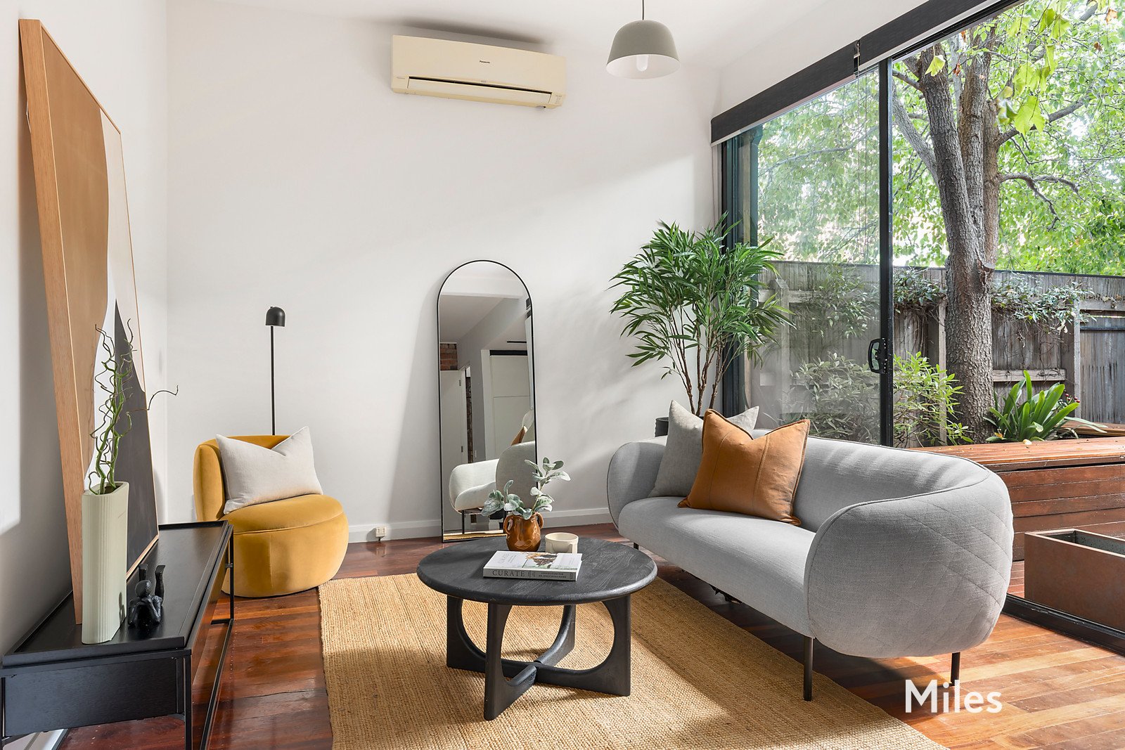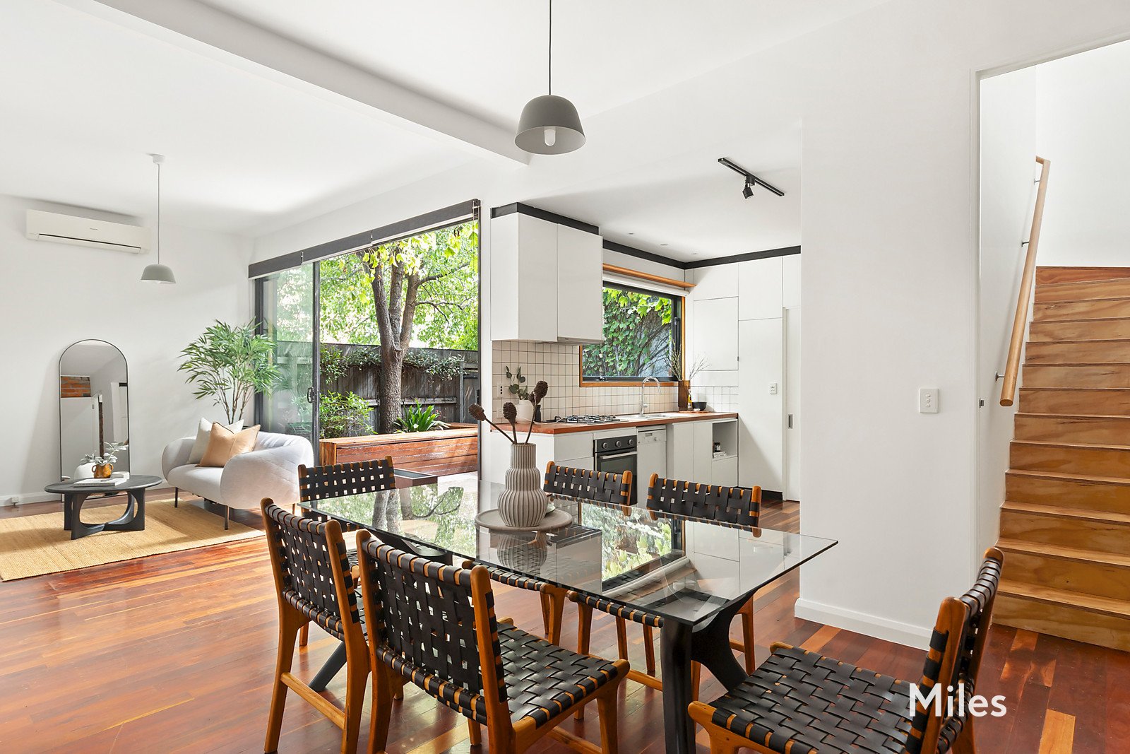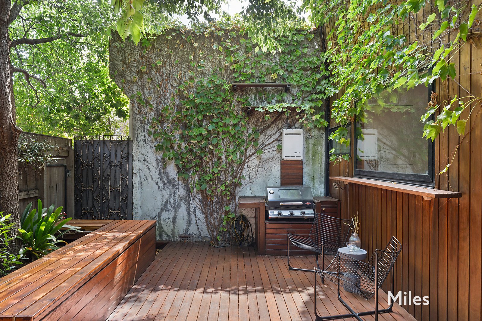 Tall sliding doors extend the living space to a leafy courtyard garden, complete with a reclaimed timber deck and integrated bench seating - a private sanctuary ideal for relaxed gatherings or quiet evenings outdoors.