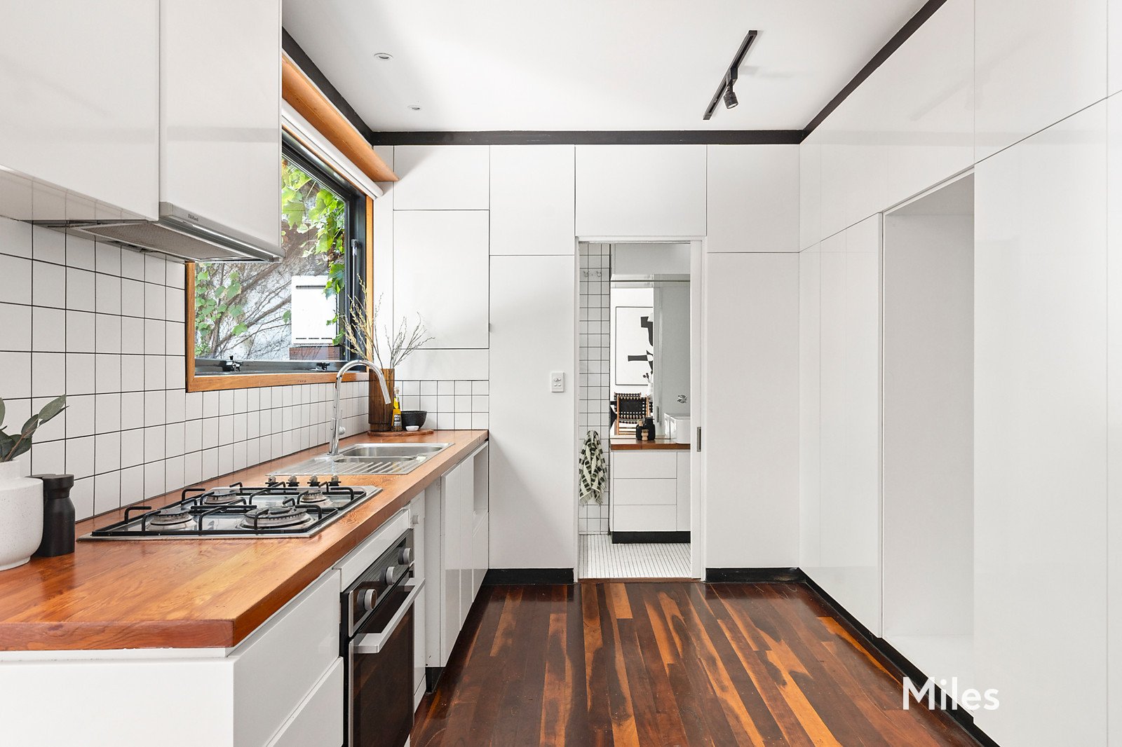 The bright, well-appointed kitchen enjoys a courtyard outlook and features stainless steel appliances, a recycled timber benchtop and excellent storage, complemented by a European laundry and a sleek modern bathroom positioned to the rear.