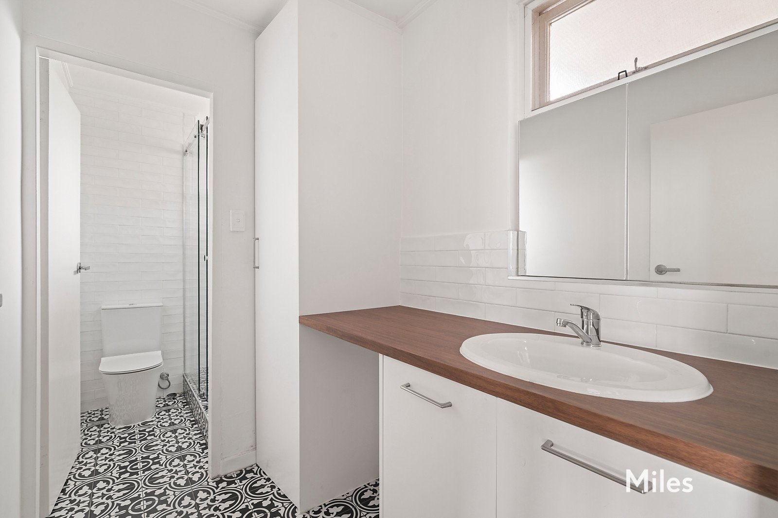 A sizeable north-facing bedroom features built-in robes with fitted hanging and shelving space, while a beautifully curated bathroom showcases chic patterned floor tiling and a frameless sliding-screen rain-head shower, completing this impeccably presented apartment with comfort, style and flair.