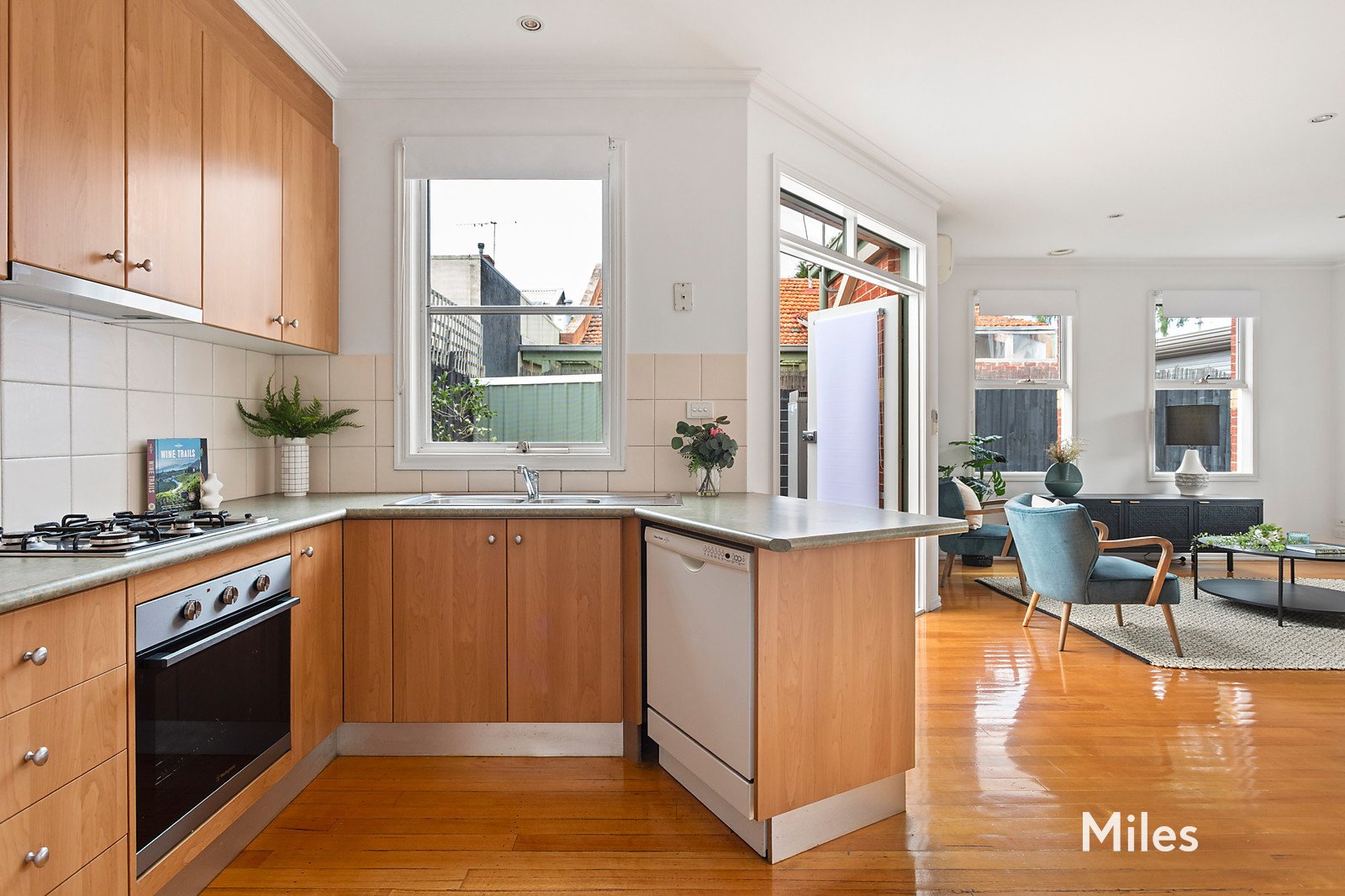 Driveway off-street parking and leafy front garden reveal a bright and spacious living and dining room that flows seamlessly through to a quality kitchen with stainless-steel appliances, along with a European laundry and French door access out to a private paved courtyard edged in garden that includes a sizable lock-up storage shed.