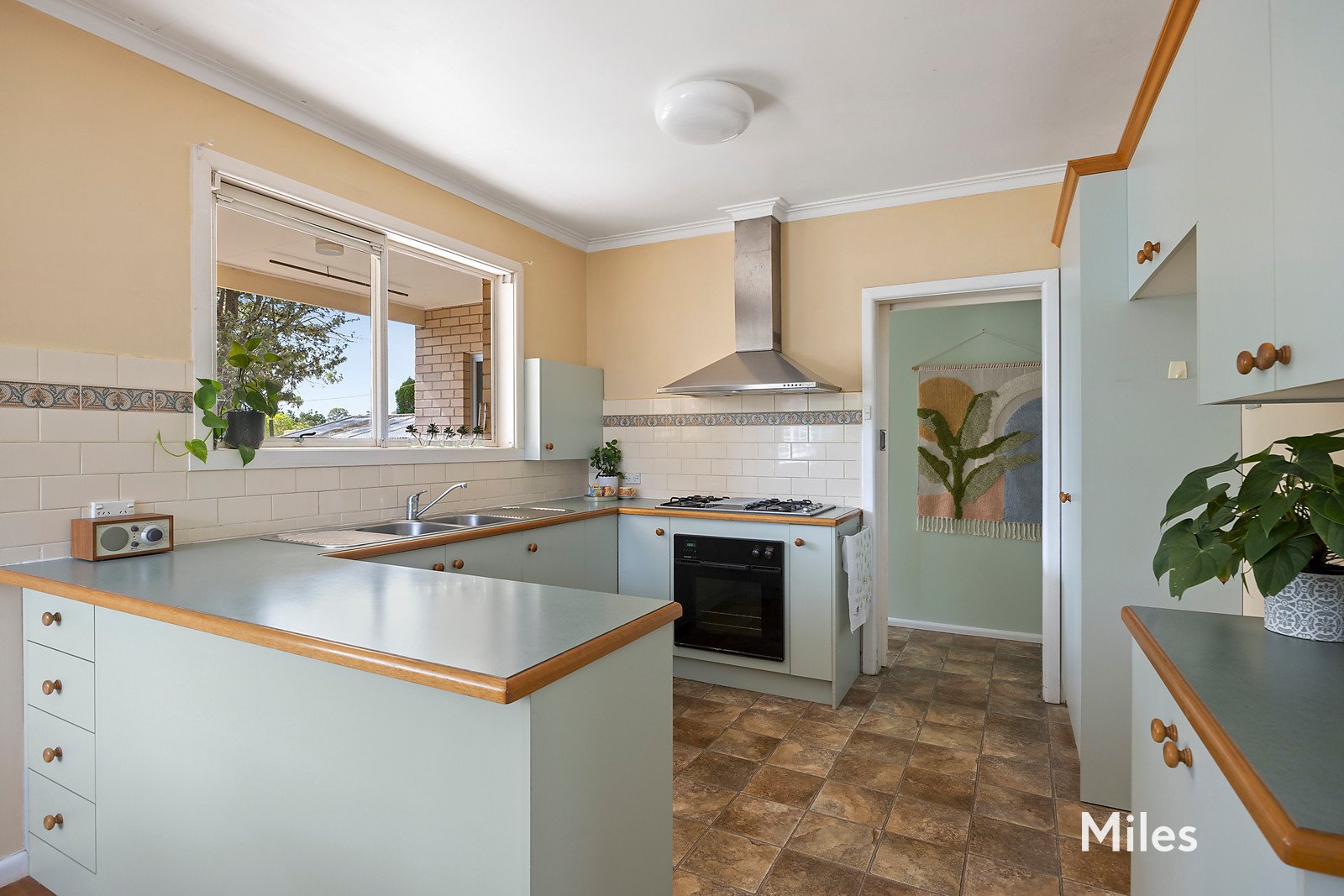 A welcoming living room sets the tone, before flowing through to a casual dining area oriented to the north that adjoins a kitchen offering generous space and clear potential while remaining entirely functional in its current form.