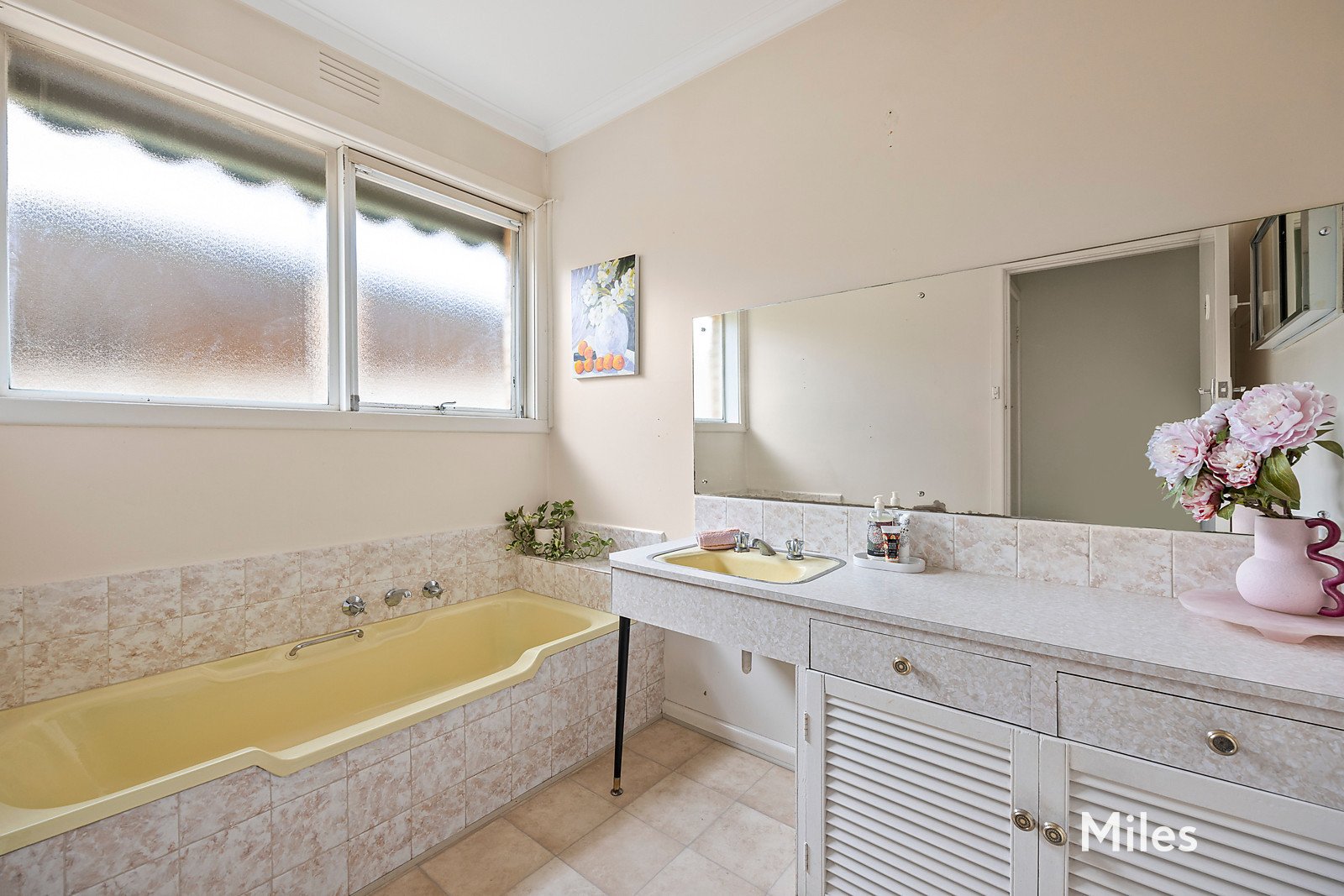 A centrally-positioned bathroom retains its distinctive retro character with original colour and detail, complemented by an independent shower room and a separate toilet, along with a full-size laundry with storage.